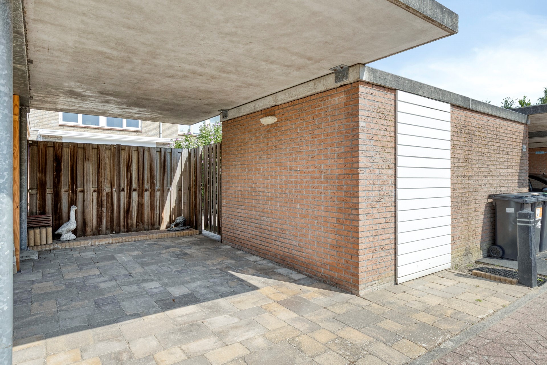 De stenen berging met betonnen dak beschikt over een brede, momenteel dichtgezette deursparing aan de straatzijde. Deze is eenvoudig weer te openen, waardoor de berging ook direct van buitenaf bereikbaar wordt. Een ideale berging voor bijvoorbeeld een bakfiets, kinderwagen, scooter of motor. Direct naast de berging bevindt zich de eigen parkeerplaats onder de betonnen carport, tevens een geschikte plek voor het opladen van een elektrische auto. Dankzij de slimme plaatsing van de schutting achter de carport is ook hier aan privacy gedacht.