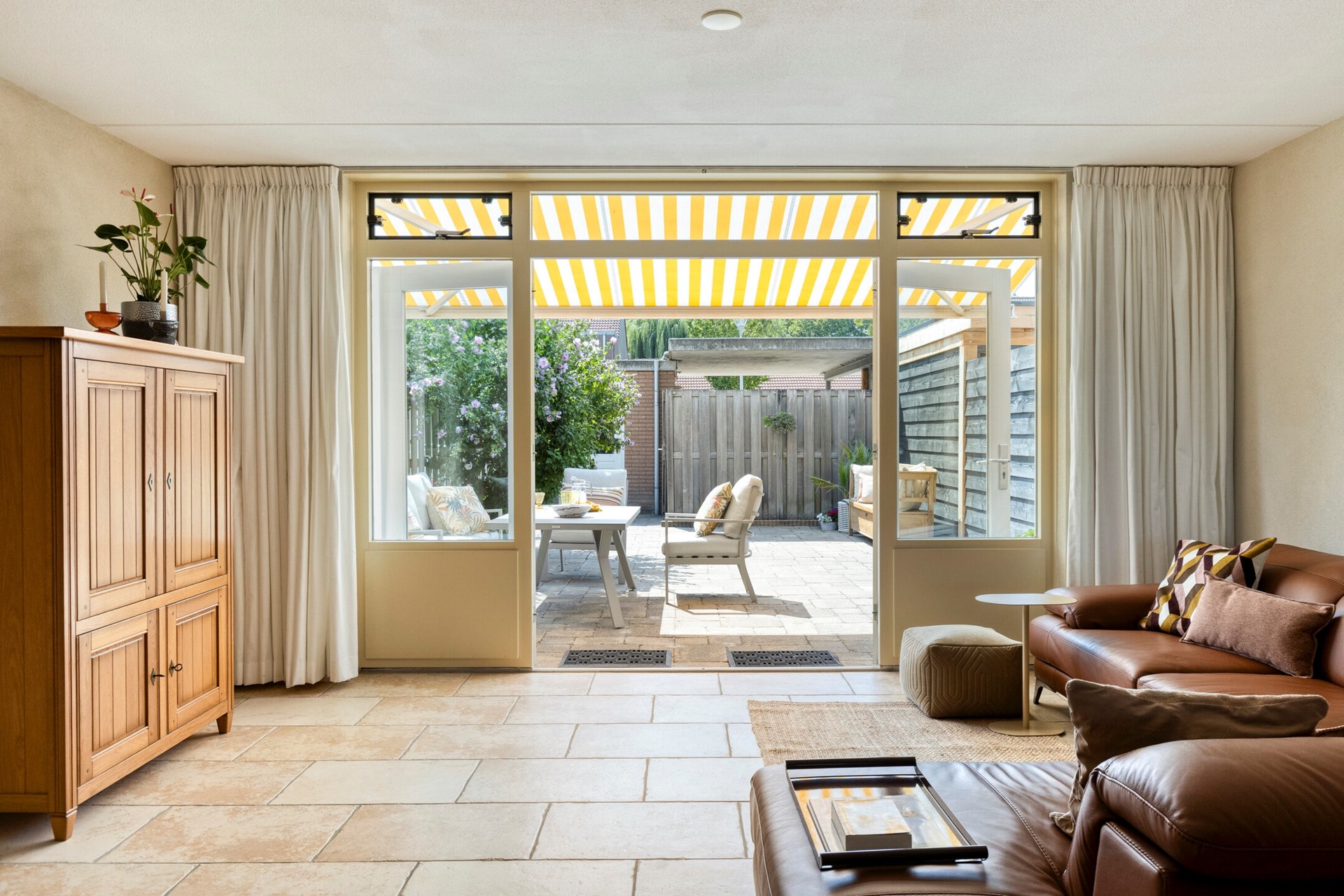 Via de openslaande deuren loop je zo de zonnige achtertuin in, gelegen op het zuidwesten. Een heerlijke plek om na een werkdag te ontspannen, buiten te eten of de kinderen vrij te laten spelen. De tuin is voorzien van een elektrisch bediend zonnescherm, een solide erfafscheiding met tuinpoort en een stenen berging met elektra en wateraansluiting.