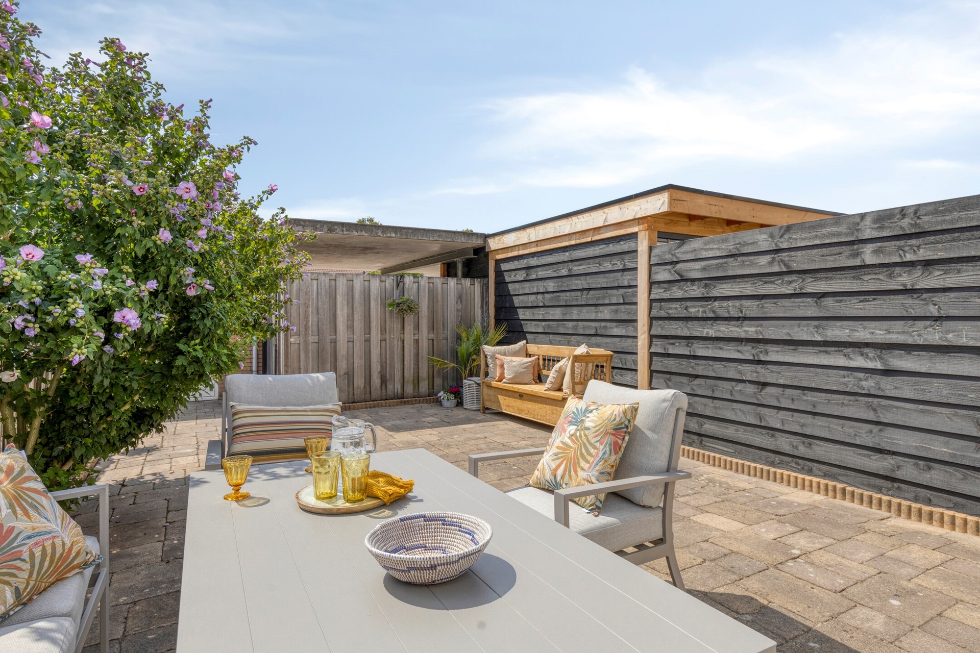 Zonnige tuin met privacy en praktische extra’s: