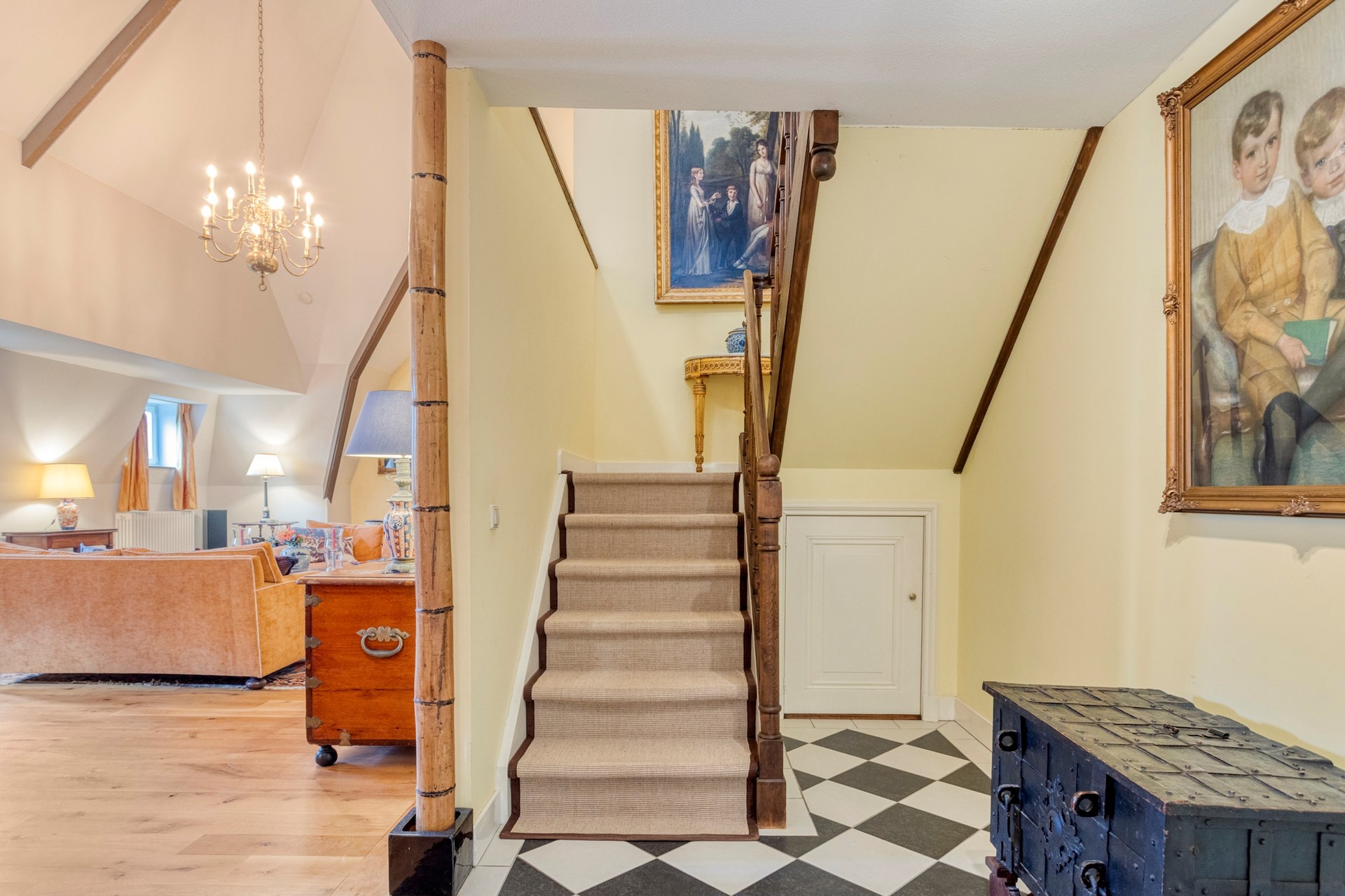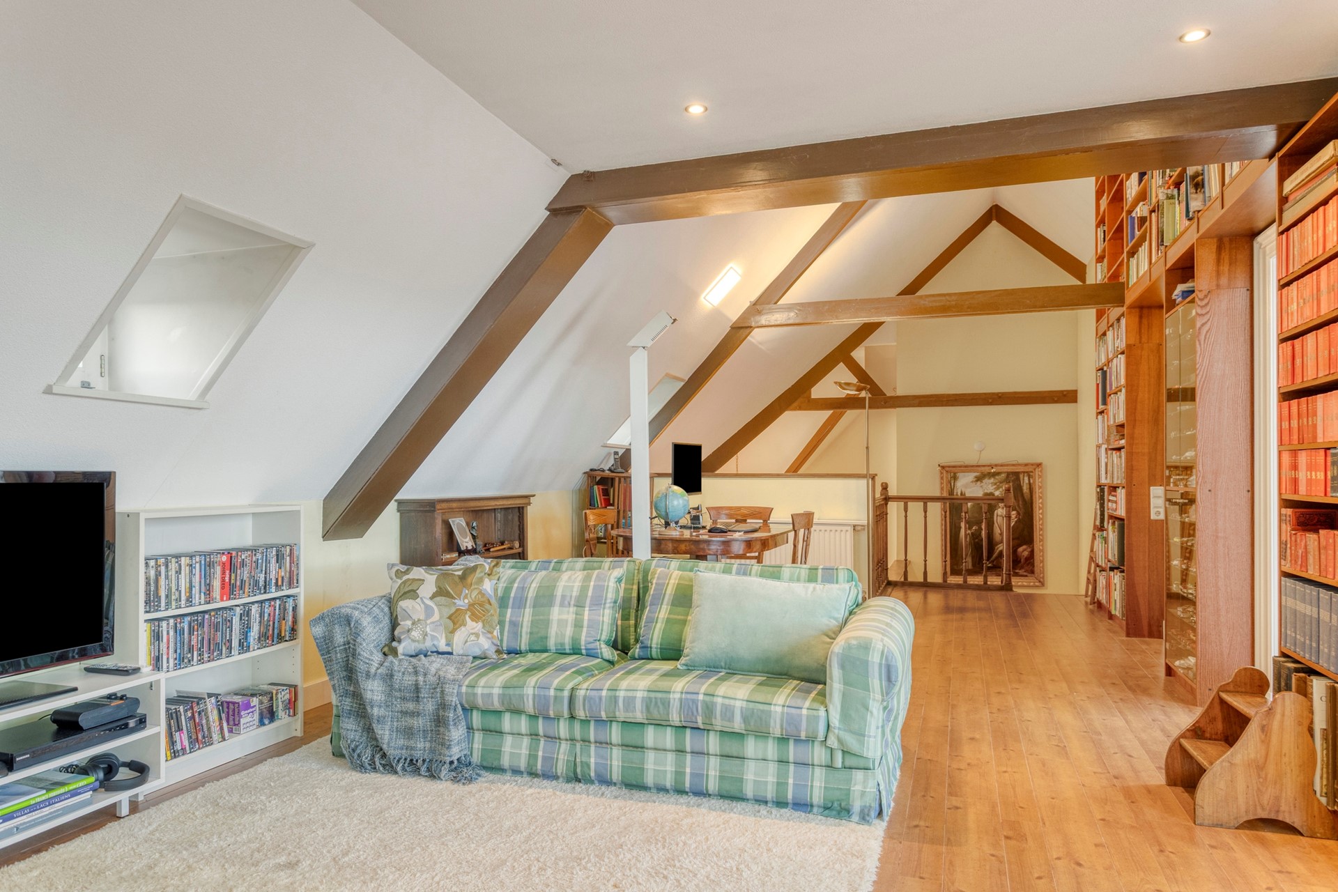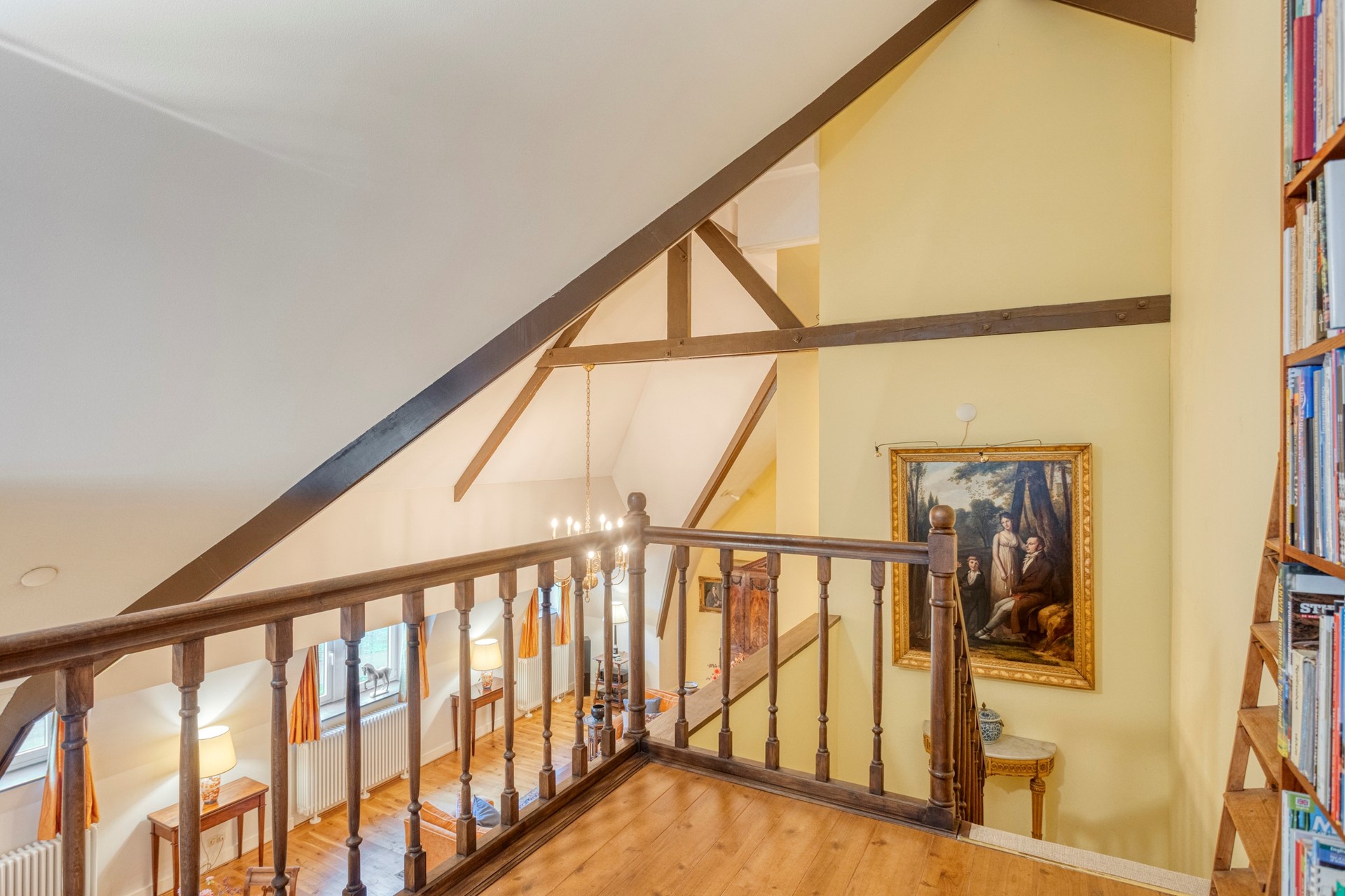 Vanaf de eerste verdieping een mooi uitzicht op de riante woonkamer op de begane grond. Deze vide geeft ook een extra dimensie aan het gevoel voor ruimte en openheid. Deze eerste verdieping is nu ingericht als bibliotheek, werkkamer en extra living. Op deze tweede verdieping ook een badkamer met ligbad, douche en toilet.