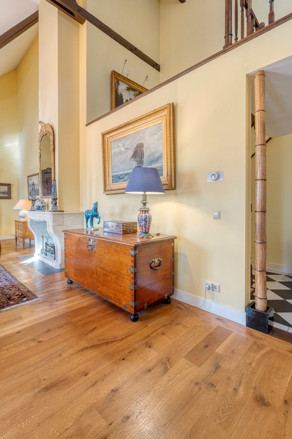 Aan het einde van de gang toegang naar een enorme grote woonkamer. Hier een opvallend hoog plafond en uitzicht op de vide. Het hoge plafond en de vide zorgen voor een enorm ruimtegevoel en een schitterende open verbinding tussen de woonkamer en de eerste verdieping. Deze combi geeft een enorm luxueuze uitstraling en ook creatieve inrichtingsmogelijkheden voor nieuwe bewoners. De combinatie van de houten vloer, de openhaard en het daglicht via de ramen zorgen voor een opvallend gezellige sfeer. Deze woonkamer is fraai zoals nu ingericht maar ook relatief gemakkelijk aan te passen naar bijvoorbeeld een uniek modern interieur.